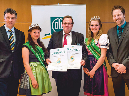 Verleihung der Urkunden für das DLG-Gütezeichen Wirkungsrichtung 6b(v. li.: René Döbelt, Mitglied im Aufsichtsrat der DLG e.V., Sächsische Milchkönigin, Dr. Udo Hölker,Geschäftsführer Schaumann BioEnergy, Sächsische Milchprinzessin, Dr. Ewald Kramer, ISF)
